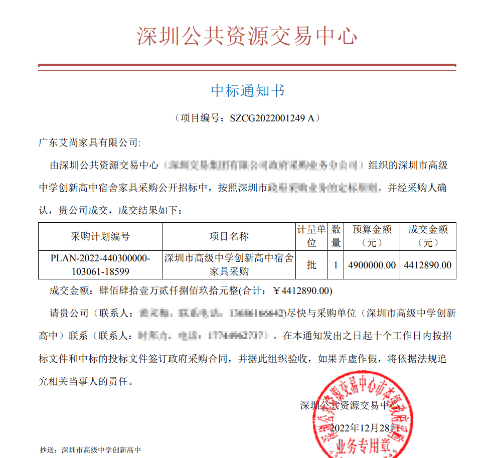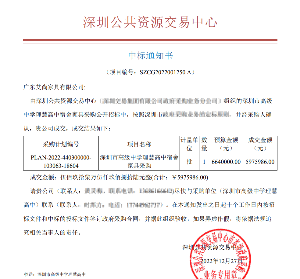 2022年底,廣東艾尚家具憑借優(yōu)質(zhì)的產(chǎn)品質(zhì)量、出色的設(shè)計(jì)方案以及熟練的工程案例經(jīng)驗(yàn),在眾多競爭對手中脫穎而出,成功中標(biāo)創(chuàng)新高中、理慧高中宿舍家具采購項(xiàng)目,中標(biāo)金額共一千多萬。