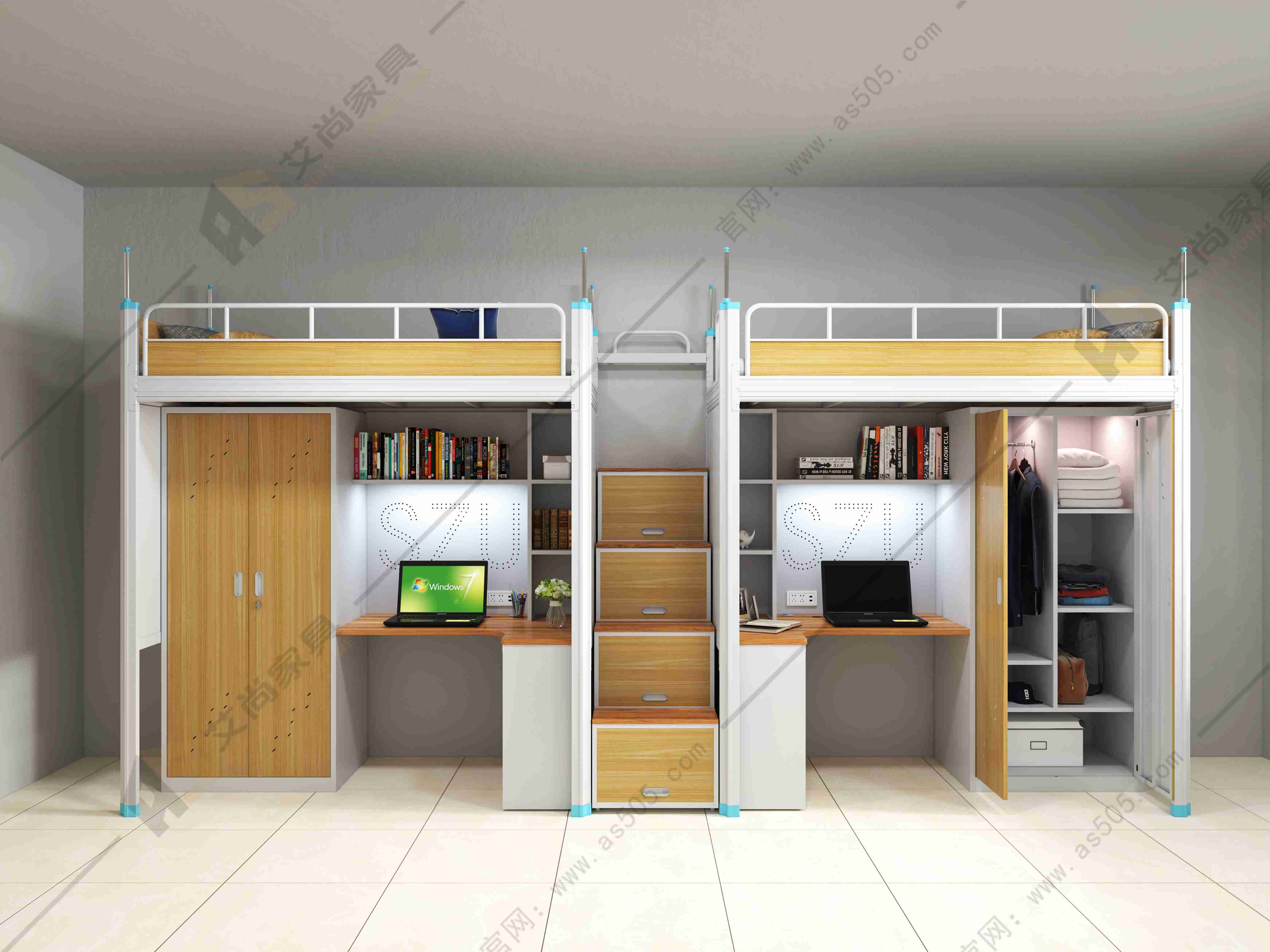 宿舍空間狹小,學生生活用品須在宿舍內整理妥當,宿舍公寓床需考慮空間利用率,上面是休息區,下面是學習區,衣柜,鞋柜,柜格等都可以提出方案和要求,定制宿舍公寓床。