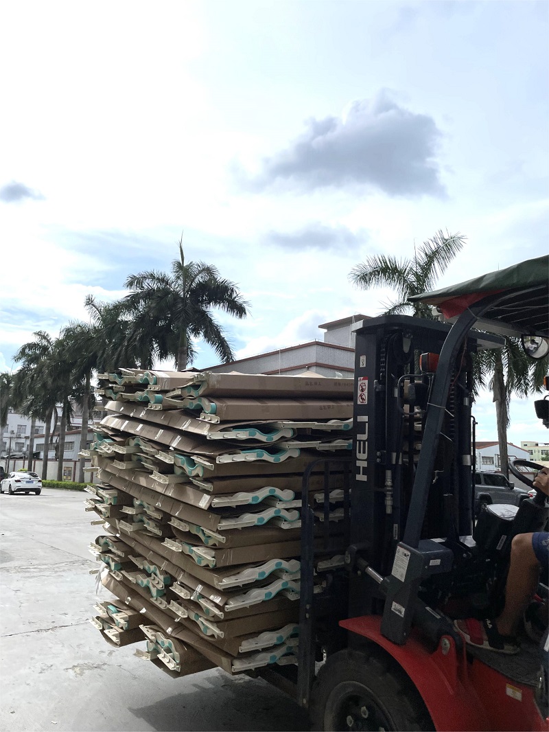 裝有宿舍床的紙箱已被整齊有序地擺放在車上,在藍天的襯托下,顯得格外整齊養眼!準備出發前往各個合作院校。裝車完畢,工作人員例行清點數量,確保數量準確無誤之后開始啟程!