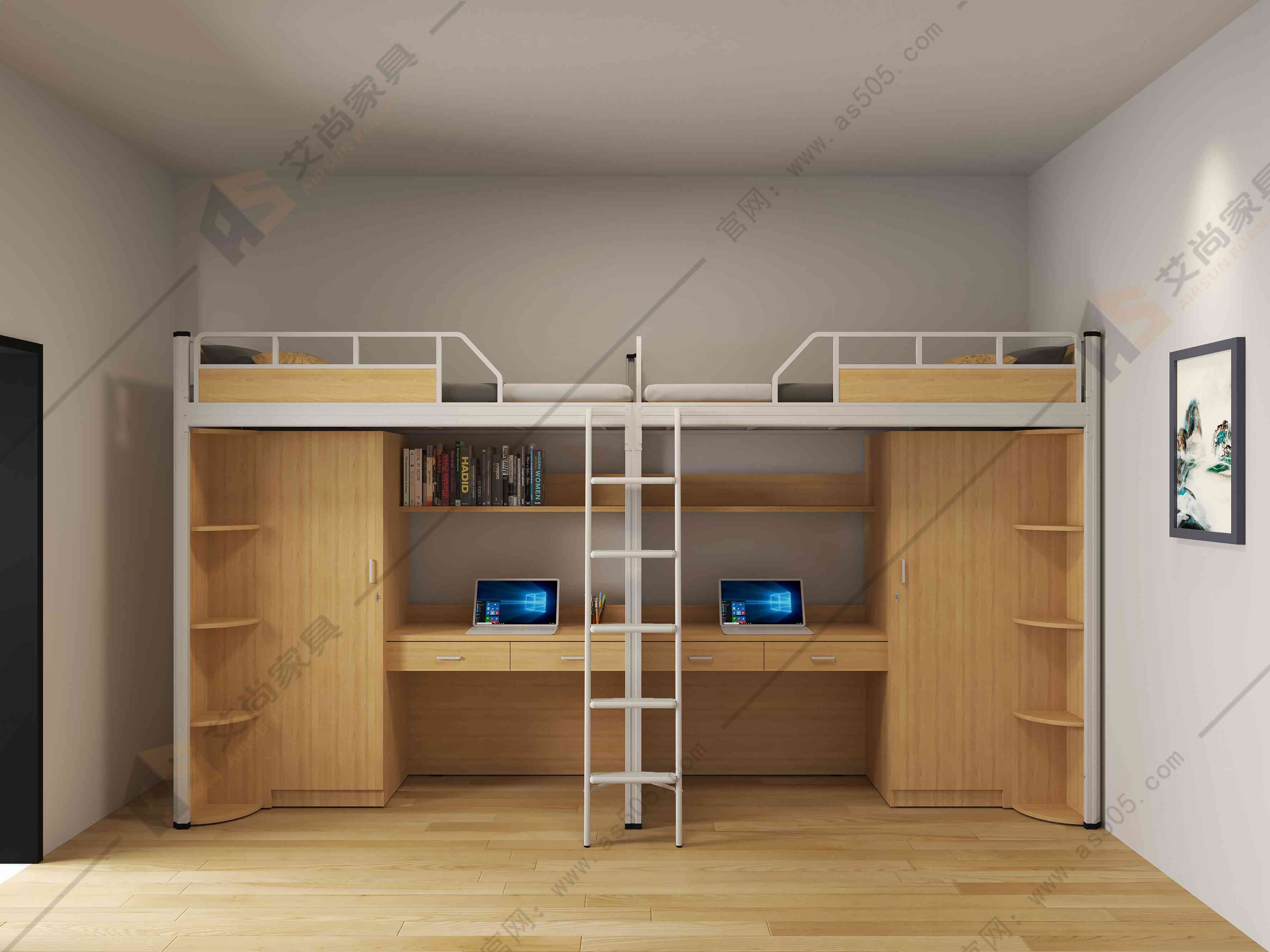 學生宿舍床不僅要穩固結實,更要在細節處多加注意,艾尚家具上鋪加高護欄是波浪形的設計,線條簡潔流暢,高度高于300mm,給人滿滿的安全感;樓梯有凹凸防滑紋,配備夜光條;配置隱私簾,整體的色調柔和溫馨,遮光效果也很讓人滿意,休息區放置一個暖色調的小夜燈,氛圍感直接拉滿;邊緣處還做圓角做修飾,防止碰撞,割傷,保證學生的安全。