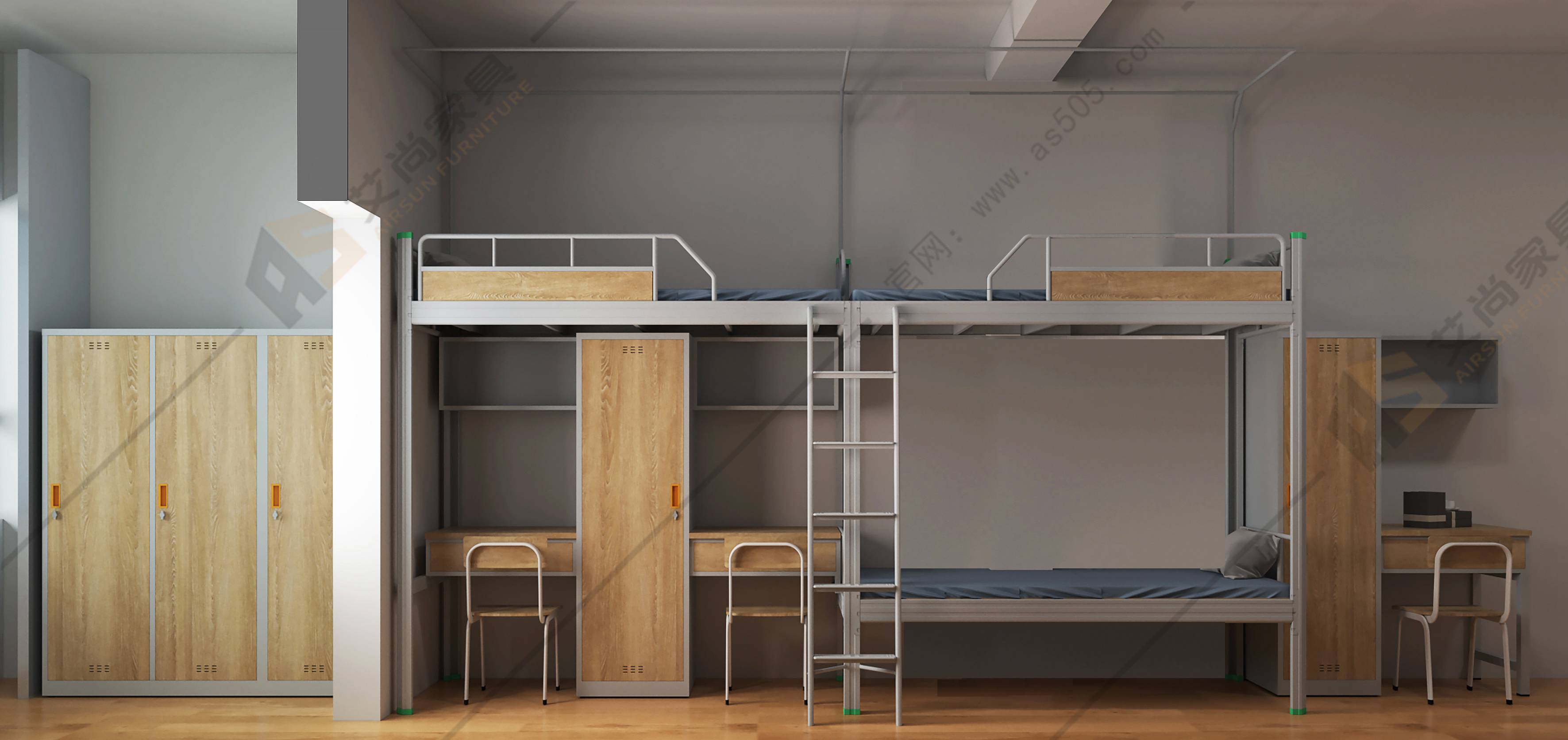 艾尚家具員工宿舍床是無螺絲的卡扣式連接的,設計以簡為主,卡扣式結構更美觀。還配有配套產品、書柜、鞋柜、衣柜、書桌等。衣柜是由鋼和木頭制成的,環保耐用無異味,讓生活更加便捷。
