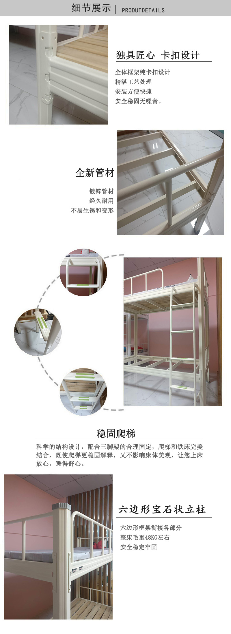 上下鋪鐵床表面全自動噴粉處理,0甲醛;中空異型結構,卡扣式連接、無螺絲;100%冷軋鋼板不參假。真正的良心企業!