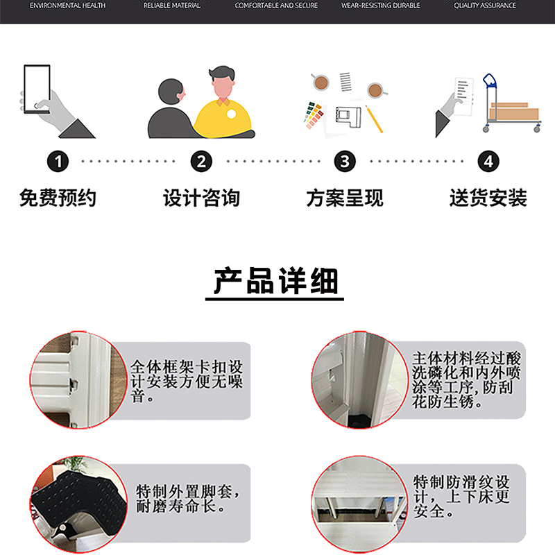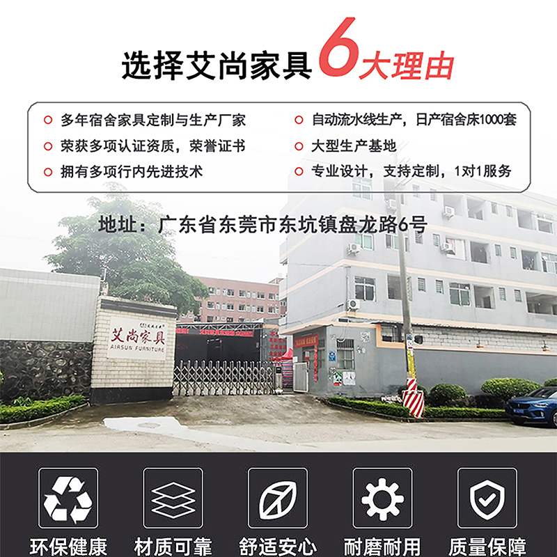 產品介紹: 艾尚家具宿舍床公寓床外觀上高端大氣,并且安全舒適。宿舍床公寓床采用環保0甲醛烤漆,無論悶熱潮濕都恍然如新。 做工設計上,宿舍床公寓床采用卡口式連接,這種連接的優點在于承重性強,穩固性好,上床時非常平穩,不易搖晃,安全舒適,可以適應各種宿舍。
